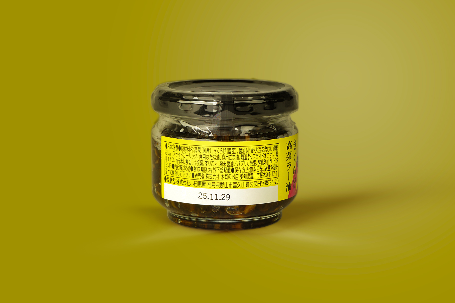 高菜(国産)、きくらげ(国産)醤油(小麦・大豆を含む)、砂糖、みりん、フライドガーリック、食用なたね油、食用ごま油、醸造酢、フライドオニオン、酵母エキス、香辛料、食塩、豆板醤、すりごま、粉末醤油/パプリカ色素、酸化防止剤(ビタミンE)