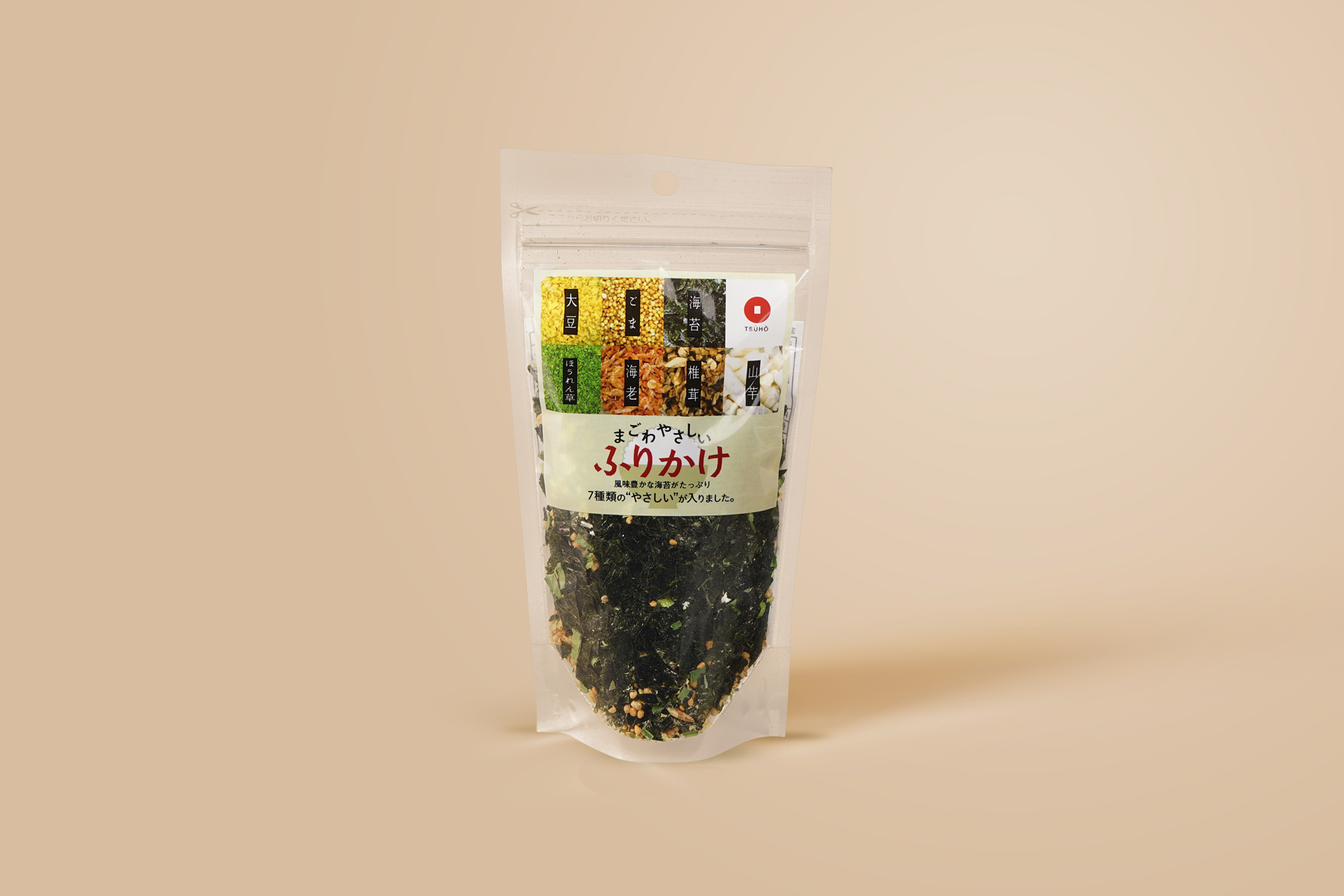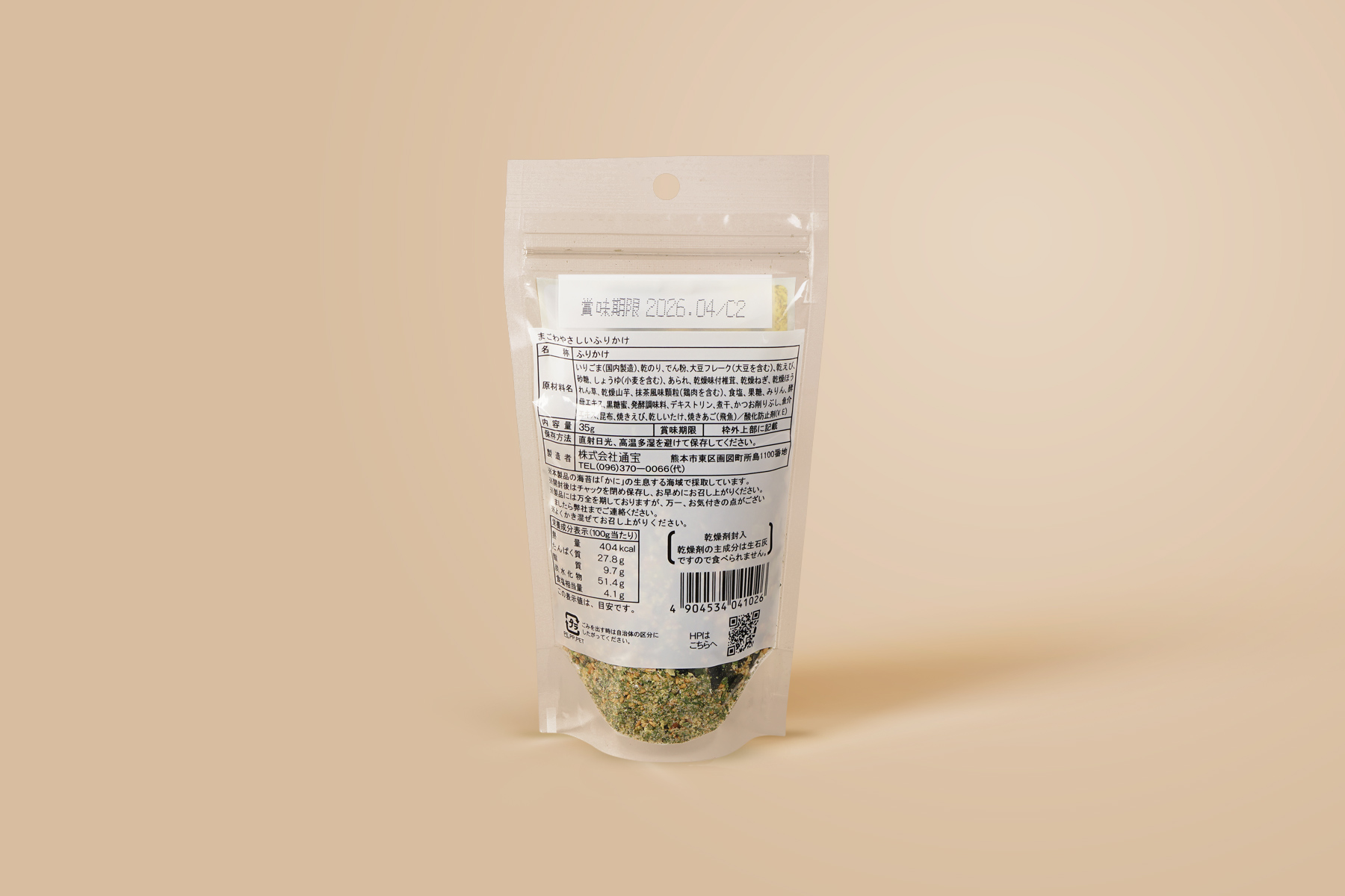 大豆フレーク(ま)、ごま (ご)、乾のり(わ)、乾燥ほうれん草(や)、乾えび(さ)、 乾燥味付椎茸(し)、乾燥山芋(い)を組み合わた、気軽に「まごわやさしい」が味わえるふりかけです。