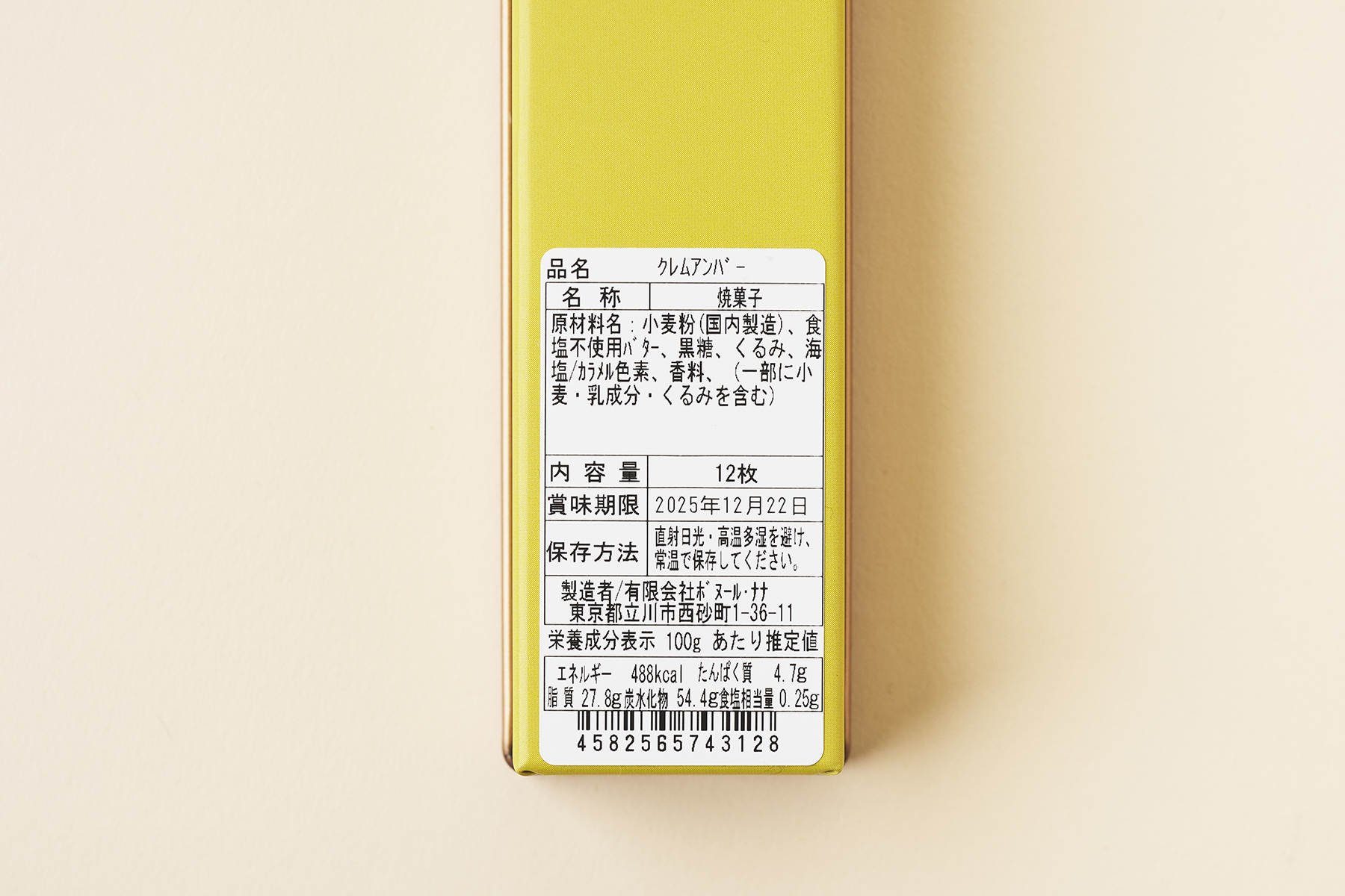 小麦粉(国内製造)、食塩不使用バター、黒糖、くるみ、海塩/カラメル色素、香料、(一部に小麦・乳成分・くるみを含む)