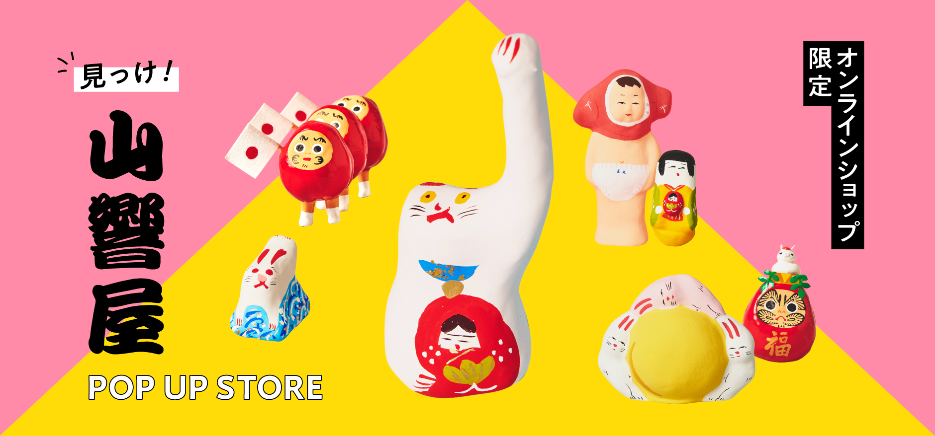 ダルマ絵師であり郷土玩具と民芸品のコレクターである瀬川信太郎さんが運営する、福岡の郷土玩具と民芸品の店「山響屋やまびこや」。だるまや招き猫、コヨリ人形など昔ながらの郷土玩具を、いまの時代に馴染むカルチャーとして発信している同店には、作品が育まれた土地や文化、作り手のバックボーンが活かされた個性豊かなアイテムが揃います。